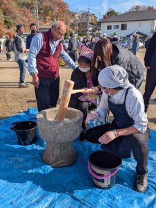 当日は、青空の下風も無く穏やかな気候でした。餅は全部で9臼つき、ボランティアの会の方々を中心につきたての餅を均等な大きさに丸めていただきました。